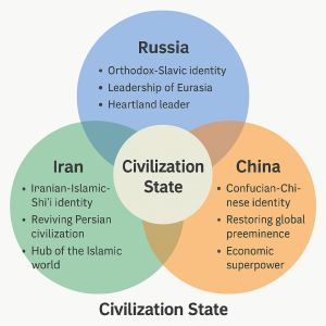 | هویت تمدنی | ایرانی–اسلامی–شیعی: ترکیب میراث باستانی ایران با اسلام شیعی، هویت مستقل در جهان اسلام | ارتدوکس–اسلاوی: میراث ارتدوکس و هویت اسلاوی، پایه اوراسیاگرایی روسی | کنفوسیوسی–چینی: میراث ۵۰۰۰ ساله چین، فرهنگ کنفوسیوسی، هویت تمدنی مستقل |